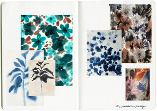 Drawing inspiration from the revered ancient Sumi Ink traditions, this captivating print unveils a meticulous process. The watercolor paper is carefully dampened, allowing the vibrant inks to gracefully bleed and intertwine, forging a mesmerizing interplay of hues. Layer by layer, pigments are thoughtfully added, meticulously building depth and fostering harmony within the intricate floral design. Turquoise hues dominate this composition, embellished with nuanced accents of clay, while the centers of the flowers subtly embrace a hint of black, adding an intriguing focal point. Blurring the boundaries between floral motifs and the allure of tie-dye, this piece exudes a timeless elegance that transcends seasonal limitations.